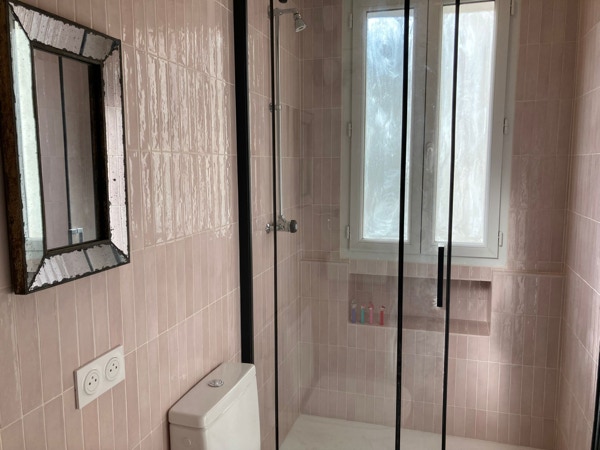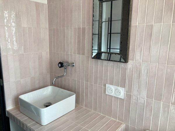 Une banquette sur mesure en bois a été installé sous les fenêtres offrant du rangement et une assise confortable