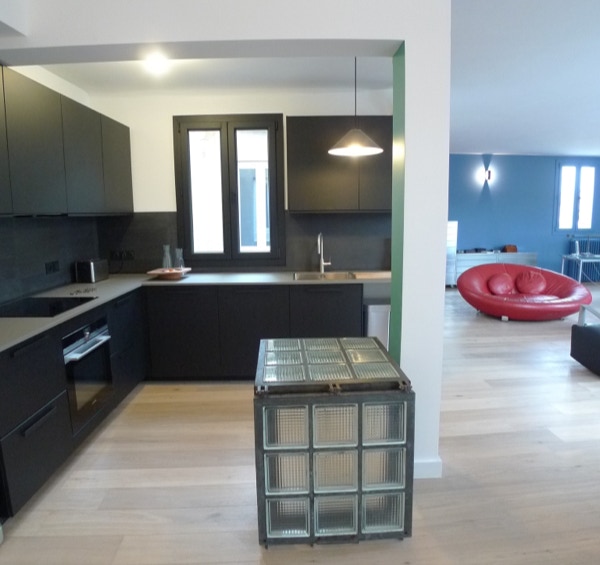 Le plan a été complètement modifié, la cuisine et la salle de bains ont été déplacé afin de créer un grand espace de vie traversant.