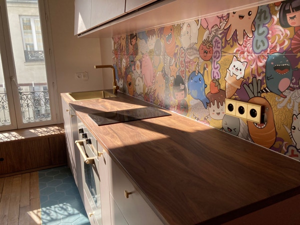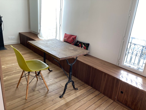 Une banquette sur mesure en bois a été installé sous les fenêtres offrant du rangement et une assise confortable