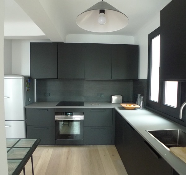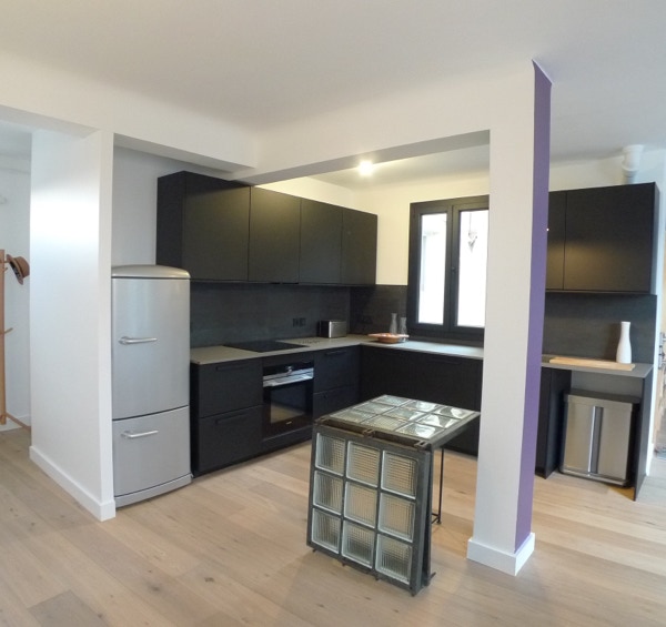 Le plan a été complètement modifié, la cuisine et la salle de bains ont été déplacé afin de créer un grand espace de vie traversant.